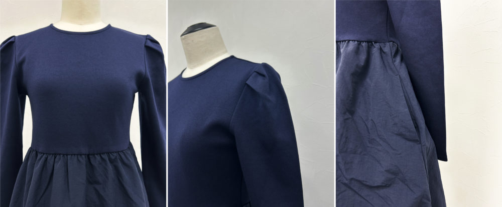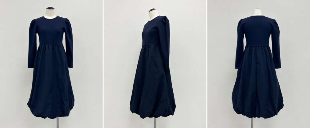 タイトめなトップスですが、パフスリーブやバルーンスカートにすることで、ボディラインを拾いすぎないデザインとなっています。