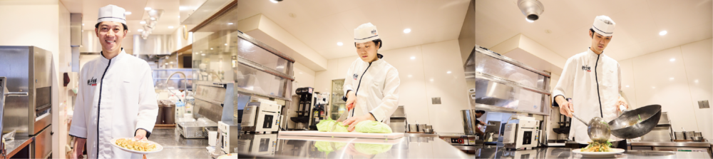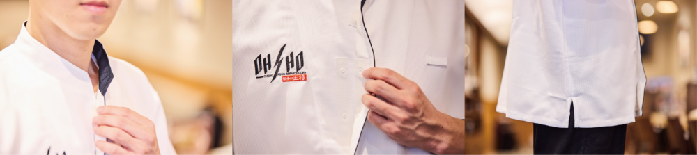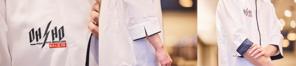 立ち襟のデザインは、スマートで凛とした姿勢を象徴します。胸元から裾にかけての一直線のパイピングが白衣の清潔さと美しさを際立たせるとともに、料理への情熱と誇りを視覚的に伝え、「餃子の王将」で働くプロの料理人たちの技術と信頼をお客さまに感じていただけるデザインに仕上げました。